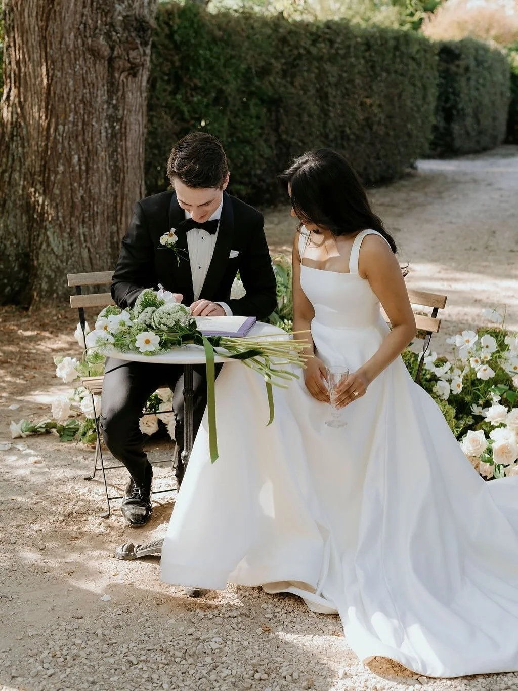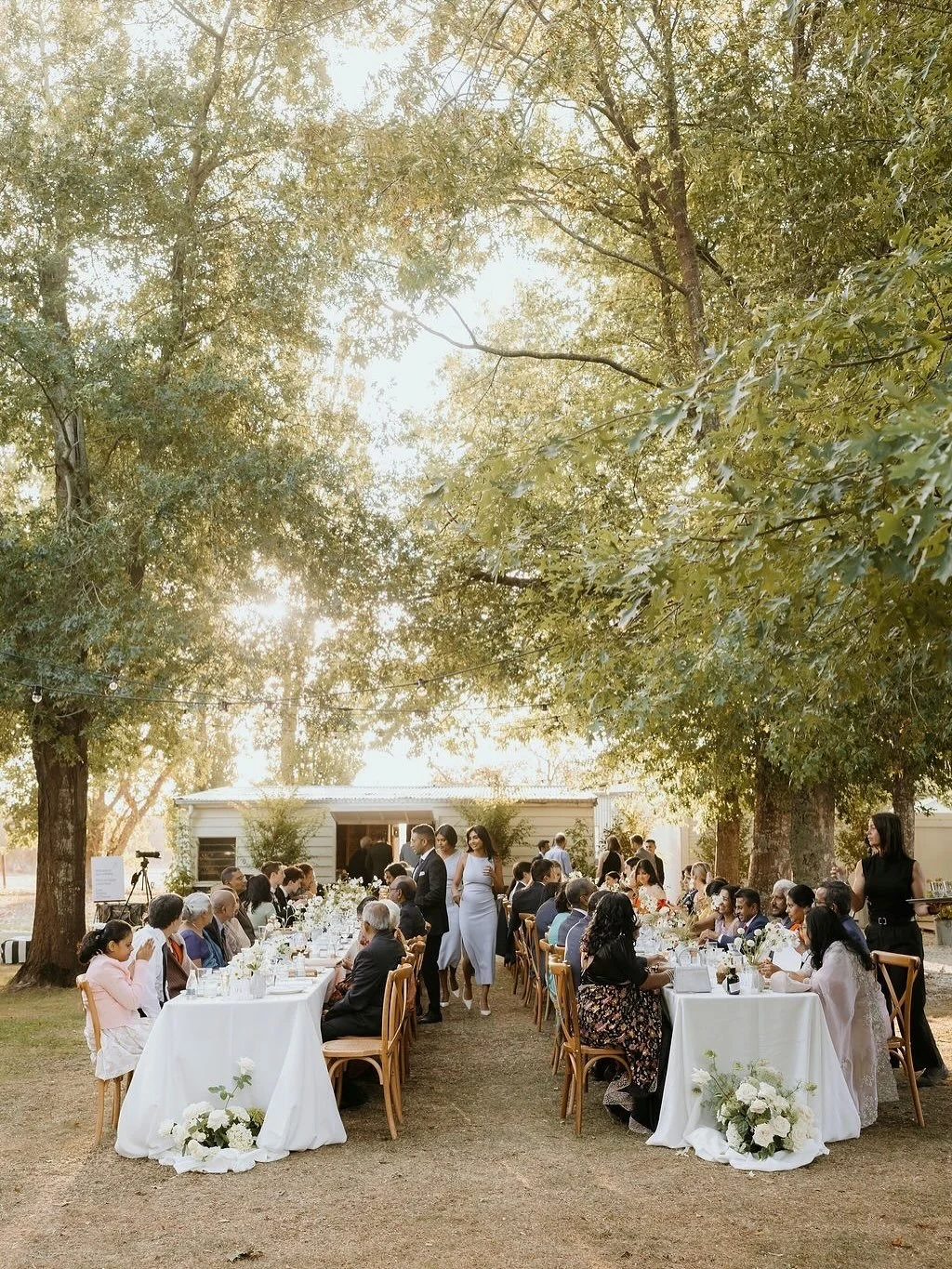 Following the ceremony, guests are traditionally served by the old dairy which has been converted into a rustic outdoor bar where you can relax and mingle with drinks and canapΓ©s in the dappled shade of sweeping pin oaks. As the sun sets behind a grove of poplars, the light and landscape turn golden, awaiting your portraits in nearby surrounds. The courtyard adjacent to the barn is another beautiful option. Hemmed by olive trees and planted with cascading tubs of rosemary, itβs a gorgeously European inspired space in which to enjoy and Aperol spritz or a gin and tonic in the sunshine.