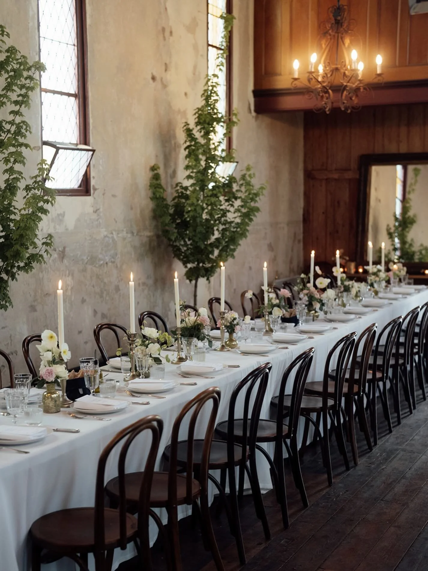 At the heart of the Churchill experience is our iconic church. With its uniquely patinated walls and original features it offers a stunning backdrop for both dining and dancing. Candlelit and styled with your favourite botanicals, it is a chameleon-like space, and can be transformed to match your imagination. For a cosier environment (think; the-most-exquisite-dinner-party-ever-thrown), our white-washed hall is a stunning option for celebrations of smaller numbers. With blooms threaded from the ceilings and tables lined with tall taper candles, there’s an intimacy to this space that’s very special.